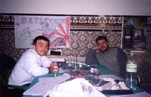 El combate discurrió casi de la forma en la que todos pueden adivinar. Josema dejó atrás al Awesome y al Archer, cogiendo buenas posiciones en las alturas. El Vindicator gracias a su salto podía maniobrar de un lateral a otro para cubrir de los ataques de los Jenners. Por su parte el Spider no podía quedarse quieto y acercarse a los mechs de Juanjo era un suicidio, con lo que estuvo incordiando a los Jenners. Juanjo por su parte plantó al Catapult en un bosque denso desde el que vigilaba todo el terreno por el que se movía Josema. El Hunchback fue acercándose intentando cubrirse con los bosques y las montañas, mientras el Archer cogía posiciones. Los Jenners no pararon de atosigar al Archer, acercándose por un lateral y no parando de saltar a su alrededor y de asatearle a láseres medios. El combate discurría de esta guisa, con un cruce de disparos entre el Catapult y las tres unidades de largo alcance de Josema. Debido a que el Catapult estaba quieto y que los mechs de Josema no paraban de moverse y a sus peores habilidades de disparo, puede decirse que la cantidad de impactos y de daño era idéntica. (Aquí creo que estuvo el único fallo de Josema, pues debería haber devastado ese bosque donde se ocultaba el Catapult). Claro que el Vindicator intentaba de vez en cuando impactar en algún Jenner. De esa forma es como se "rompió" el combate. El Vindicator se colocó tras un salto adyacente al borde del tablero y Juanjo movió un Jenner a su vera, justo enfrente. El otro Jenner por su parte había saltado a una posición en la que tenía cobertura parcial. Debido a que era mejor un disparo en cobertura parcial que efectuar el disparo a bocajarro con un CPP, el Vindicator terminó disparndo contra el segundo Jenner. Al igual que en la partida anterior, el CPP impactó en la cabeza. Pero esta vez no hizo falta criticos, pues la cabeza de un Jenner sólo aguanta 10 puntos de daño. Juanjo casi mantuvo una cara de poker(tan sólo rota porque yo había profetizado que el Vindicator iba a arrancar la cabeza al Jenner y se había cumplido.). El Jenner restante no había efectuado ningún disparo y en la fase de ataques físicos declaró un empujón. Tal y como Guillermo y yo nos esperábamos, pues esa había sido también una jugada clave de nuestro anterior combate.Con una cara de sorpresa, tanto de Josema como la del mechwarrior del Vindicator, el empujón tuvo exito y el Vindicator se precipitó fuera del terreno de juego. Tal y como se habái establecido en las reglas, ese Vindicator se consideraba eliminado. En un único turno habían caido dos mechs, uno por cada bando. Y aun quedaba tiempo para realizar un par de turnos mas. El hunhcback estaba ya a muy poca distancia de tiro del Archer cuando el Awesome volvió a impactar en una cabeza. Pero esta vez el Hunchback aguantó y no cayó fulminado. El siguiente turno era el último y Juanjo optó por esconder al Hunchback tras un muro y aguantar todo el chaparrón final sobre el Catapult. Como ese bosque denso seguía estando, los disparos de Josema no lograron destruir al Catapult.