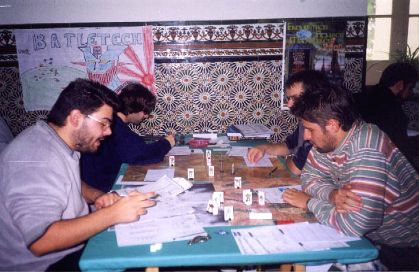 No se bien cómo se desarrollaría el combate, pero sí puedo imaginar la estrategia de Juanjo(Ya que después si pude ver sus combates). Imagino que retendría atrás al Catapult sin parar de disparar mientras el Hunchback avanzaba a toda velocidad hacia sus enemigos, precedidos por la pareja de Jenner que los acosarían por los flancos.) Pero en la foto puede apreciarse que los Mechs se fueron acercando bastante hacia el centro del tablero(Al menos en el momento de la foto, jeje)