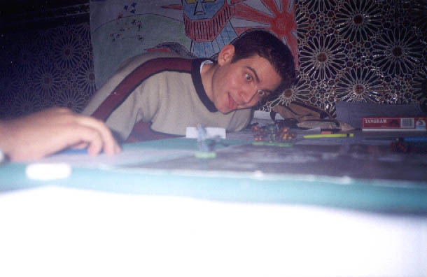 En esta foto parece que el flash jugó una mala pasada. Pero no es la única que muestra la foto. Como puede apreciarsen hay 3 mechs apelotonados,no?. Pues resultó que tras mostrar nuestros movimientos ocultos el mech de Carlos vino corriendo desde la mitad del mapa hacia una casilla que había sido escogida también por Guillermo, que venía saltando de otro lado, y el pobre Alberto se quedó allí encajonado sin poder moverse. Y esa es la cara que se le quedó a Albector cuando se vió acorralado tras las tiradas de iniciativa que resolvimos para solventar tan delicada situación. El mech de la izquierda es el que llevaba Fernando y el de la derecha es el de Sven. Por supuesto hice que Albector se agachara para que Mazinger le acompañara en la foto. |